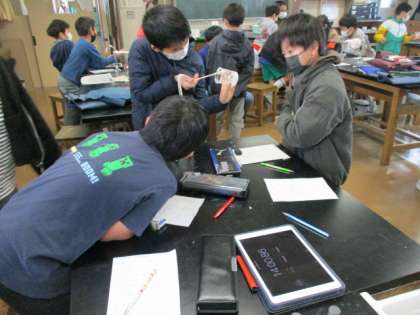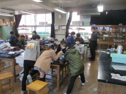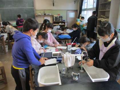 1組の授業は理科です。昨日2組がやっていた「水がこおるときの様子を調べる実験をしています。試験管の中でこおった水を見つめている人がたくさんいました。「マイナス3度だった。「マイナス5度だった。」と、子どもたちは教えてくれました。