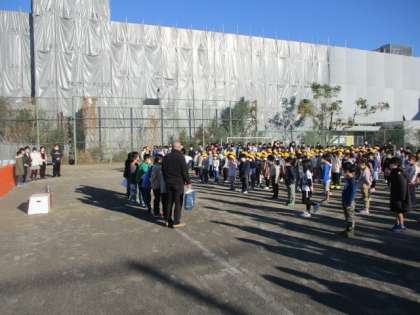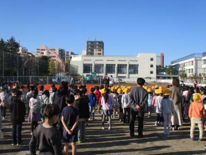 月曜の朝は全校朝会です。校庭改修が始まっていますが、池尻中学校側の校庭で朝会を行いました。