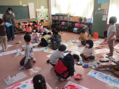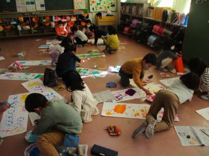 1組の授業は図工です。家から持ってきた材料を使って、大きな紙に絵の具でスタンプをしています。材料が様々なので、いろいろな形がスタンプされています。