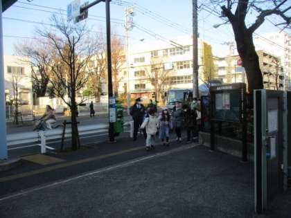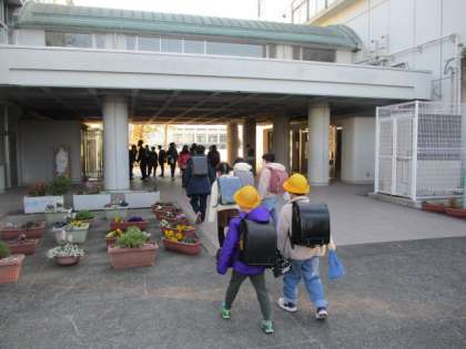 子どもたちが登校してきました。気持ちのよい朝の陽ざしが子どもたちを迎えてくれています。今日も池尻交番のおまわりさんが、子どもたちを見守ってくれました。