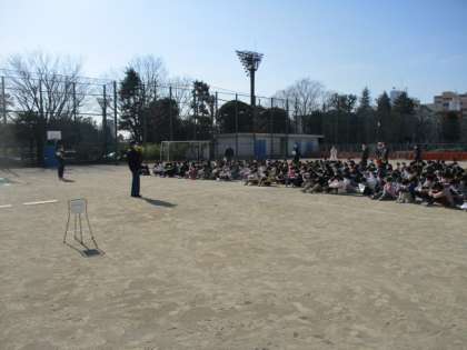 今日は家庭科室から火災が発生したという想定で避難訓練を行いました。校庭改修が始まってから初めての校庭避難です。子どもたちは落ち着いて校庭に避難してきました。