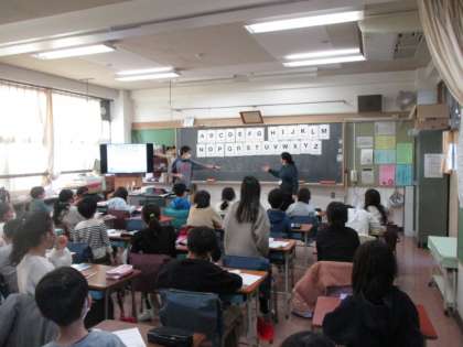 1組の授業は外国語です。ALTの先生と一緒にアルファベットの学習です。