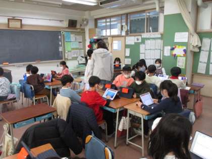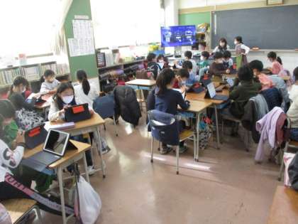 2組の授業は総合です。年間を通して学習しているビオトープについて、自分たちで考えた観点でまとめています。保護者の皆さんへの発表や2年生への引継ぎを意識して、子どもたちは取り組んでいます。