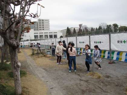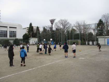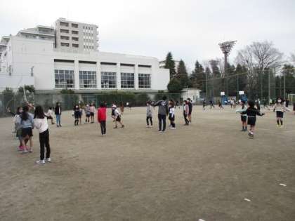 昼休みになりました。今日の校庭の割り当ては、3年生4年生です。お日さまが雲にかくれ、少し肌寒く感じますが、たくさんの人たちが校庭に出ています。
