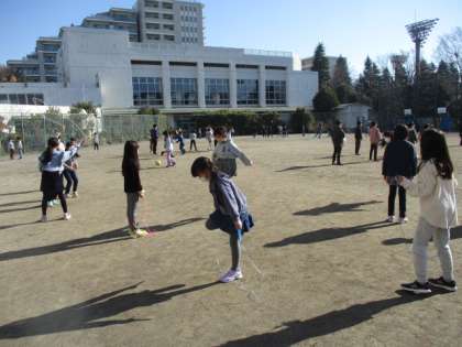 グランドでは、短縄や長縄、ドッジボール・おにごっこなどをしています。中央昇降口近くでは、鉄棒をしている人たちもたくさんいました。足かけ回りやこうもりなど、いろいろな技をしていました。