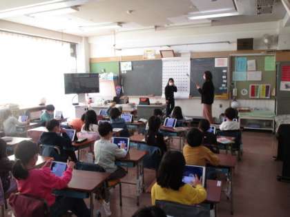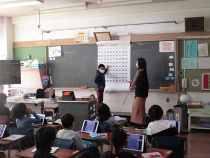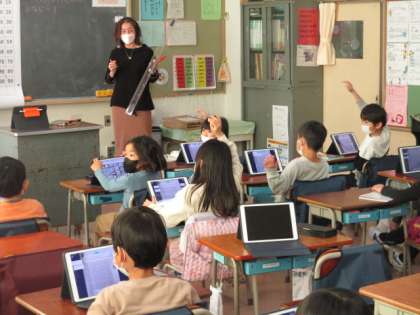 1から100までの数を表にまとめたものを見て、気付いたことを発表しています。「この列は、十の位と一の位の数が同じです。」「この列は、一の位が下がっていって、十の位は上がっています。」など、するどい気づきの発表がたくさんありました。