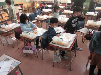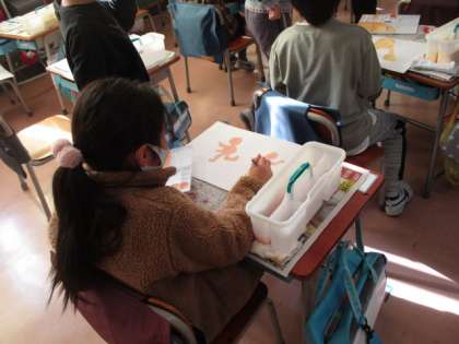 2組の授業は、図工です。絵の具で人の身体をかく学習です。