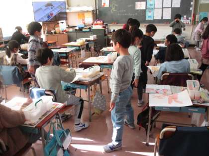 人の身体をかこうとうすると、1年生はどうしても棒人間になりがちです。関節を意識して、身体の部位の動きをよく見てかくことで、動きが生まれてきます。友達にポーズをとってもらって、それをかいている人もいました。