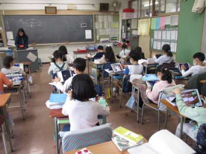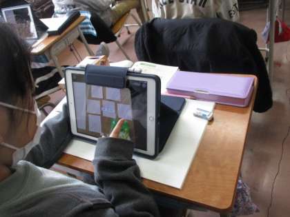 1組では、前の時間写真に撮った友達の箱の面の形の写真を見て、気付いたことなどを話し合っていました。