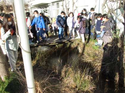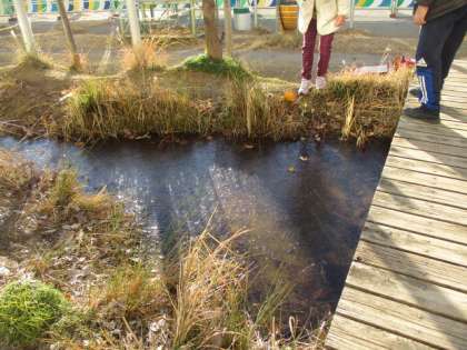 早めに登校してきた子どもたちが、ビオトープに氷がはっていることを教えてくれました。見てみると、一面きれいな氷です。たくさんの人たちが、ビオトープに集まってきました。近くにいた人に「スケートができちゃうね。」と、言ったら、間髪を入れずに、「できないよ!」と、言われてしまいました。確かにできるわけないですね。