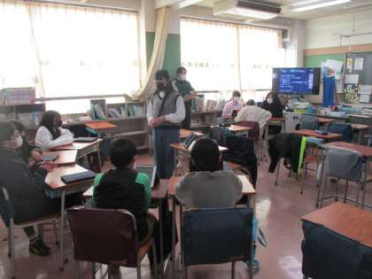 子どもたちが、「戦争や平和」についてのテーマを決めて調べたことを発表し合います。子どもたちが興味関心の高いテーマを選んでいることもあり、聞いている人たちも真剣です。発表している人の語りにも熱が入ります。発表のあとは、一人ひとりに感想やメッセージなどを送っていました。