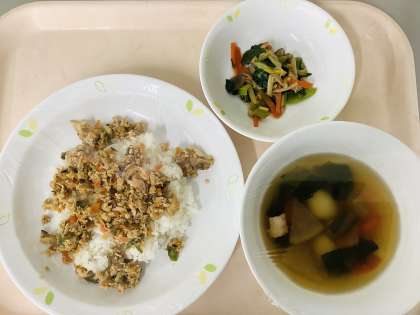魚のそぼろご飯 煮浸し じゃがもち汁 牛乳