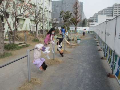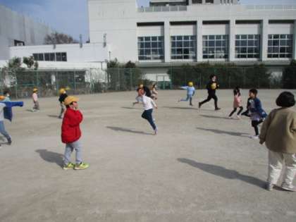 校庭では、「どろけい」「おにごっこ」「こおりおに」「ボール遊び」などをして、子どもたちは元気いっぱいに走り回っています。昇降口の前では、一輪車や鉄棒などに夢中になっている人がいます。暖かく、遊ぶのには、もってこいの昼休みです。