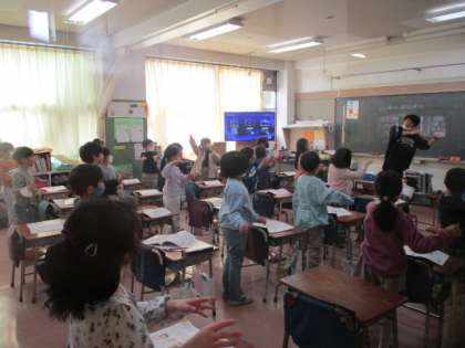 2組は、音楽をしていました。リズムに合わせ、踊りを踊っていました。担任の先生もノリノリでした。