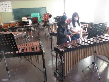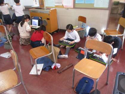 2組の授業は音楽です。「パフ」の合奏です。各パートに分かれていろいろな楽器の練習をしていました。