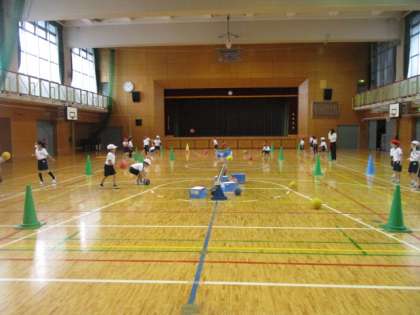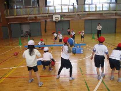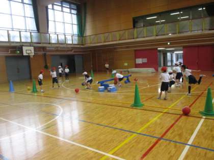 ボールを投げてコートの真ん中に置いた段ボール箱を、相手のコートに押し出すゲームです。子どもたちは、段ボール箱めがけて、思い切りボールを投げていました。