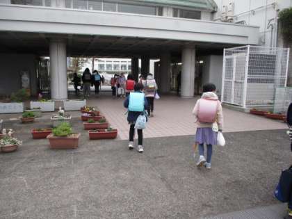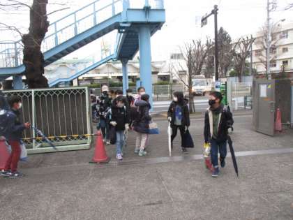 天気予報では、昼前から雨です。たくさんの子たちが、長い傘を持って登校しています。