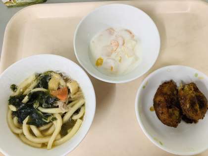 わかめうどん たこあげ フルーツヨーグルト 牛乳
