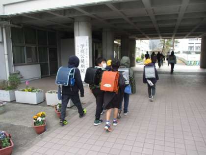 子どもたちが登校してきました。北風が強く寒い朝です。