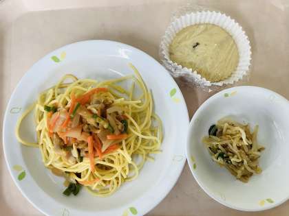 ボンゴレスパゲッティ もやしの胡麻和え 甘納豆入り蒸しパン 牛乳