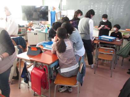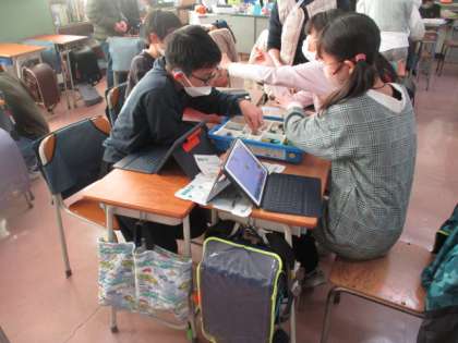 レゴのWeDoを使っての学習です。さすが6年生、ブロックで作ったものにプログラミングをして、いろいろな動きのする物を作っていました。参観にいらした保護者の方も驚いていました。