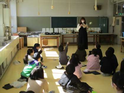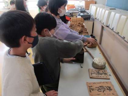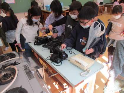学校にある昔の道具を子どもたちが実際に手に取って見ています。わら草履なのどのわらでできたもの、七輪、昔の紙、黒電話などがあります。子どもたちは黒電話のダイヤルを実際に回し、電話をかける真似をしていました。興味津々な子どもたちです。