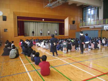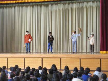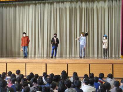 ステージに立っている人がどのように変わったかを考える間違い探しゲームです。分かりやすいものがあれば、分かりにくいものもあります。とても楽しい企画でした。全校のみんなは、ステージくぎづけになっていました。