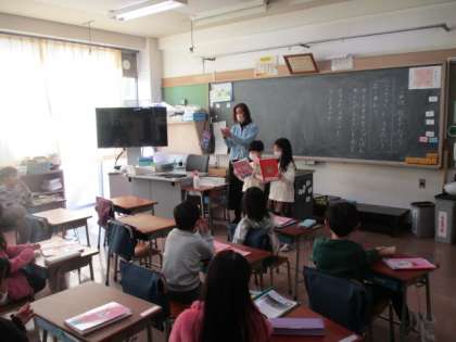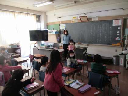 1組の授業は国語です。クイズを作り、ヒントと共にクラスのみんなに出題します。学校のの中にあるものが答えなので、子どもたちはヒントが出るたびに教室の中を見回していました。