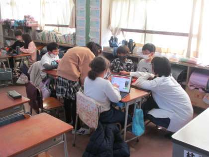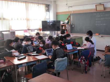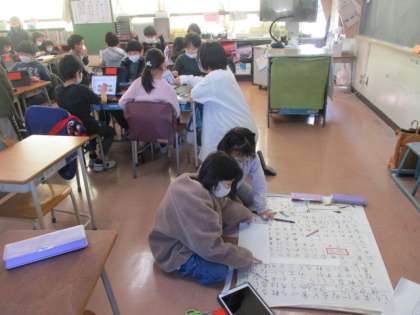 3年生の授業は、総合です。ビオトープについて1年間学習してきたことを2年生に伝えるために、発表の準備をしています。ビオトープギルドの方にいらしていただき、アドバイスをもらっています。