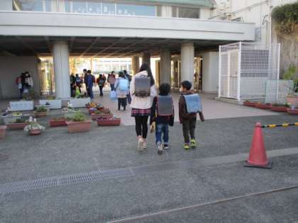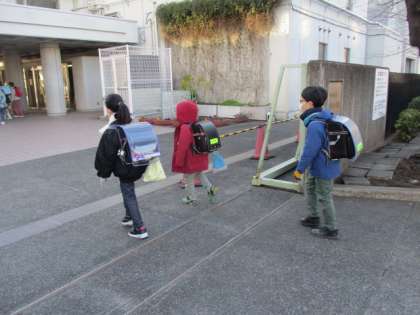 子どもたちが登校してきました。日差しはあるのですが、北風が強く寒く感じる朝です。寒い朝でも、元気に登校してくる子どもたちです。