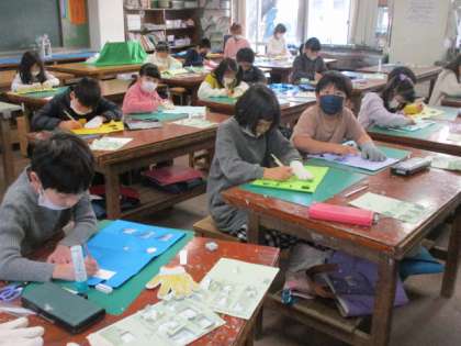 2年生の授業は図工です。画用紙をカッターで切り抜いて窓を作り、たてものを作ります。