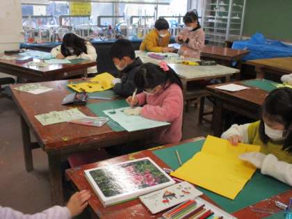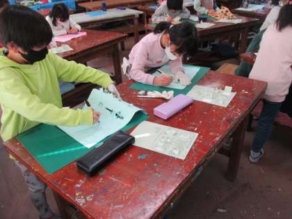 鉛筆でかいた思い思いの形の窓をカッターで切り抜きます。曲がった線や細かい模様をかいた人は、切り抜くのに苦労をしていました。しかし、切り抜けた時は、「できた。」と、喜びの声をあげていました。