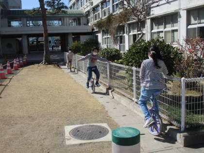 子どもたちは、ボール遊び、おにごっこ、一輪車などで遊んでいました。
