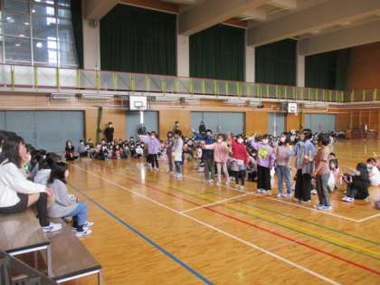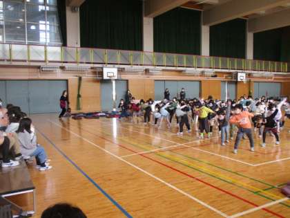 1年生の出し物は、6年生に聞いたことのクイズです。6年生の好きな給食第1位は「揚げパン」だそうです。クイズのあとは、6年生が3年生の時に運動会で踊った、「USA」を披露してくれました。