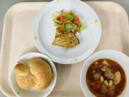 セサミパン タンドリーフィッシュ パリパリサラダ 鶏肉と大豆のトマト煮 牛乳