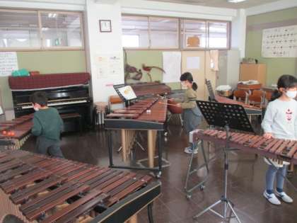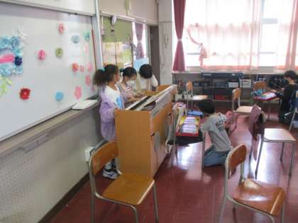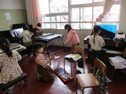 1組の授業は音楽です。「こぐまの2月」の合奏です。子どもたちは、自分の担当の楽器の練習に一生懸命に取り組んでいました。校長先生は、楽器の演奏が苦手だったので、子どもたちを見ていて、うらやましくなってしまいました。