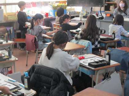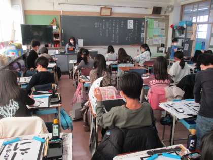気持ちを落ち着けるため、私語をしないで筆を動かしています。