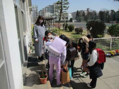 職員室前では、友達と担任の先生とで、最後のお別れをしていました。