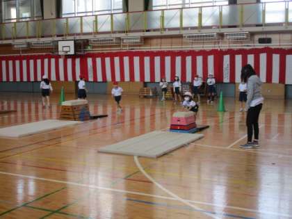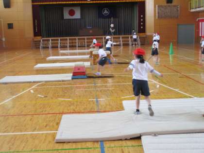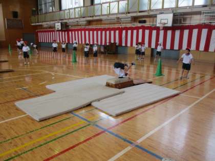跳び箱をまたいだり、跳んだり、台の上で前転をしたりと、子どもたちはいろいろな跳び方をしています。様々な場があるので、子どもたちは自分で選んで楽しそうに取り組んでいました。