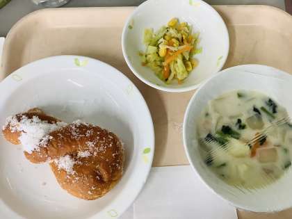 揚げパン ほうれん草クリームシチュー ジェノバサラダ 牛乳