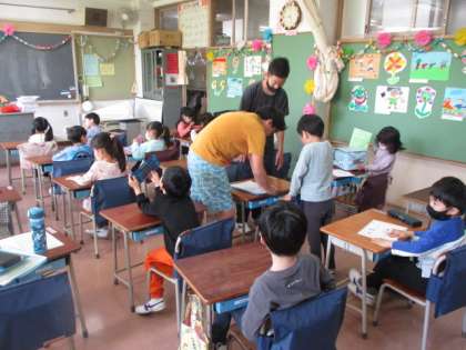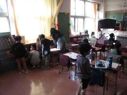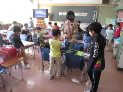 朝、1年生の教室をのぞいてみると、朝の支度をしていました。6年生が1年生について、やり方を見てあげています。
