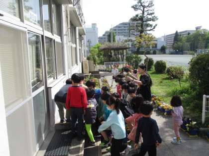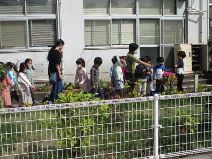 1組は、校庭にあるものを観察に行きました。花壇に咲く花、ビオトープ、裏にある畑など、子どもたちにとっては初めて見るものもあり、とっても大喜びの1年生でした。1年生にとっては、すべてのものが新鮮です。