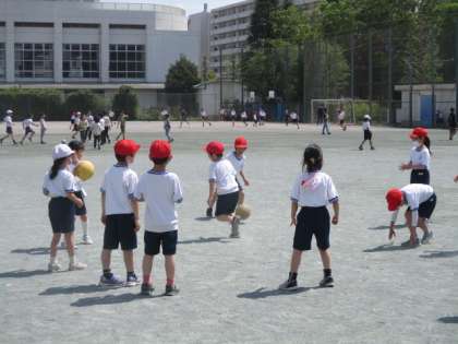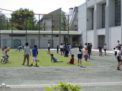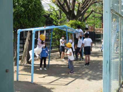 たくさんの子どもたちが校庭に出てきています。おにごっこやボール遊びをしている人、うんていやジャングルジムで遊んでいる人もいます。ビオトープを観察している人もいました。