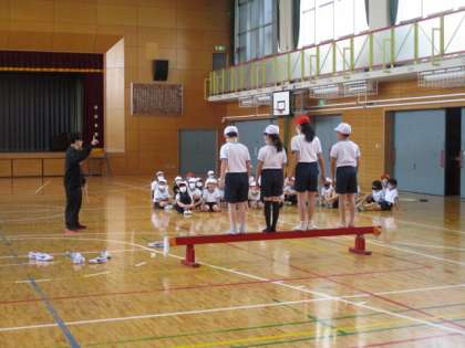 1組は体育館で体育をしていました。からだほぐしの運動です。平均台の上にグループで乗って、落ちないように指定された順番に並び順をかえます。友達と息を合わせて移動しないと、落ちてしまいます。落ちないで移動できるでしょうか。