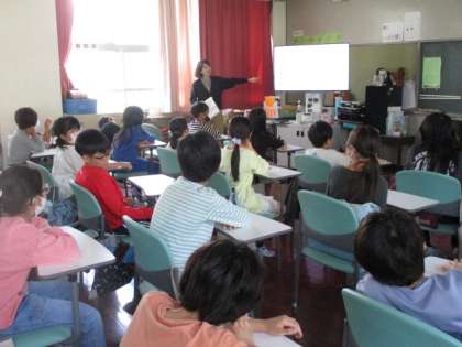 2組は音楽の授業をしていました。音楽の先生は今年からの新しい先生です。授業の最初は先生の自己紹介です。子どもたちの楽しみな気持ちが、先生に向けられていました。