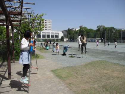 ボール遊び、おにごっこ、一輪車や竹馬など子どもたちは、元気に遊んでいます。上手に竹馬をしている6年生の姿を見て、低学年の人も竹馬をやり始めました。