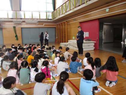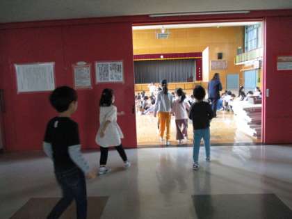 学校の案内が終わったグループは体育館に集合です。2年生1年生とそろって、振り返りです。