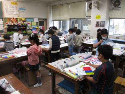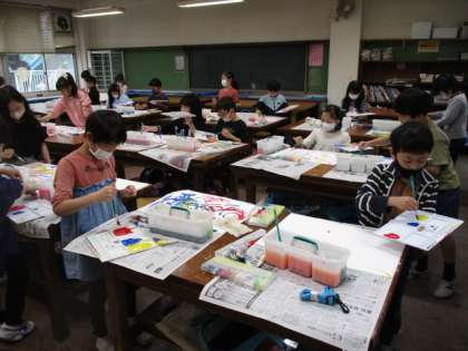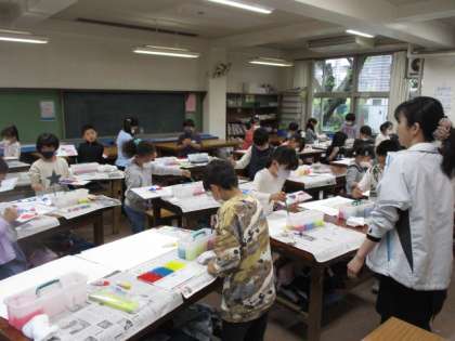 1組の授業は図工でした。「絵の具と水のハーモニー」と題して、赤青黄の三色だけを使い線を工夫してかいていきます。子どもたちは、水の分量に気を付けながらかきすすめます。大人ではかけないような面白い線がたくさんあります。