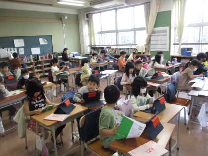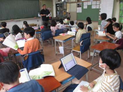 教科書の文を音声入力で、タブレットに入力しています。はっきりと滑舌よく読まないと、認識してくれません。子どもたちは、口をしっかりと開け、丁寧に発音し入力をしていました。改行の際には、「改行」と言うと、改行になります。文のつくりにも、意識を向けていました。