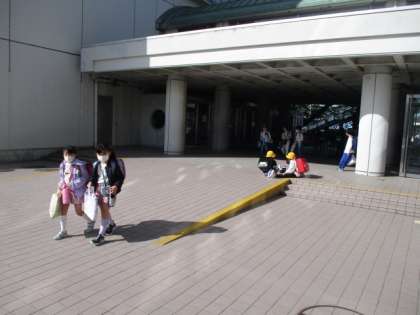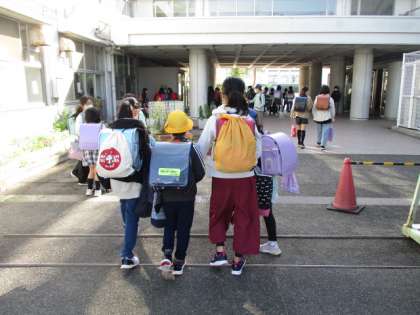 子どもたちが登校してきました。とても気持ちよい青空が広がっています。